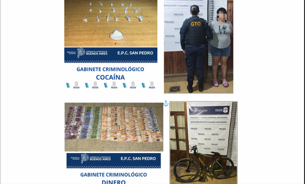 En el lugar también fue aprehendida la moradora de la vivienda, de 37 años, a quien se le secuestraron 16 bochas de cocaína y un trozo compacto de la misma sustancia, con un pesaje total de 24,8 gramos, además de dinero en efectivo.