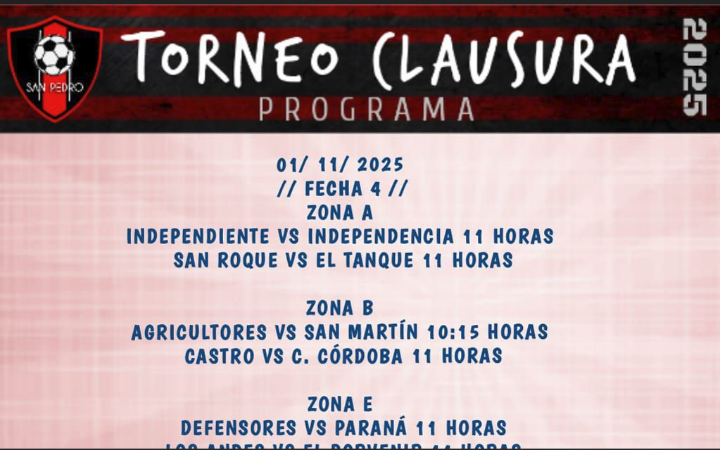 Este fin de semana continúa la acción del Torneo Clausura 2025 del fútbol infantil sampedrino, con programación confirmada para todas las zonas. La actividad se desarrollará entre el sábado 1 y el domingo 2 de noviembre, con una doble jornada para las zonas C y D, mientras que el resto de los equipos solo disputarán sus partidos el sábado.