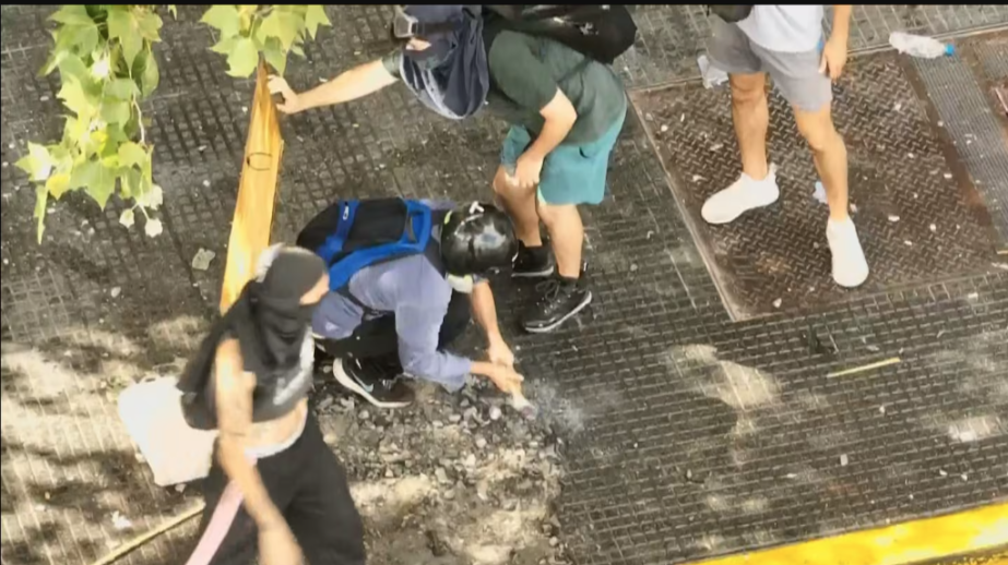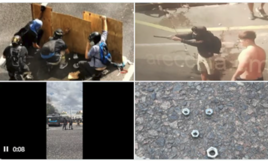 Varios manifestantes intentaron agredir a la Policía con bombas molotov. En medio del caos, fueron dispersados por el camión hidrante, pero los presuntos agresores continuaron atrincherados frente al cordón policial.