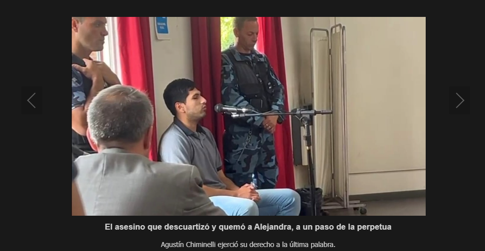 Finalmente, Agustín Chiminelli tomó la palabra: “Quiero manifestar que todo este tiempo recapacité sobre mi vida y sé que todo estuvo mal desde el principio. Pido perdón a la familia de Alejandra. Estoy muy arrepentido de lo que hice. Fue algo horrible. Actué solo en todo momento, mis padres no tienen nada que ver. Le pido a Dios que le dé fuerza a la familia y a mí para poder cambiar”.