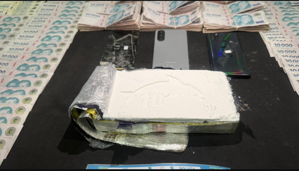 Durante la requisa, los agentes hallaron un ladrillo de cocaína de un kilo con el sello de un delfín y el número 10, además de celulares, dinero en efectivo y dólares.