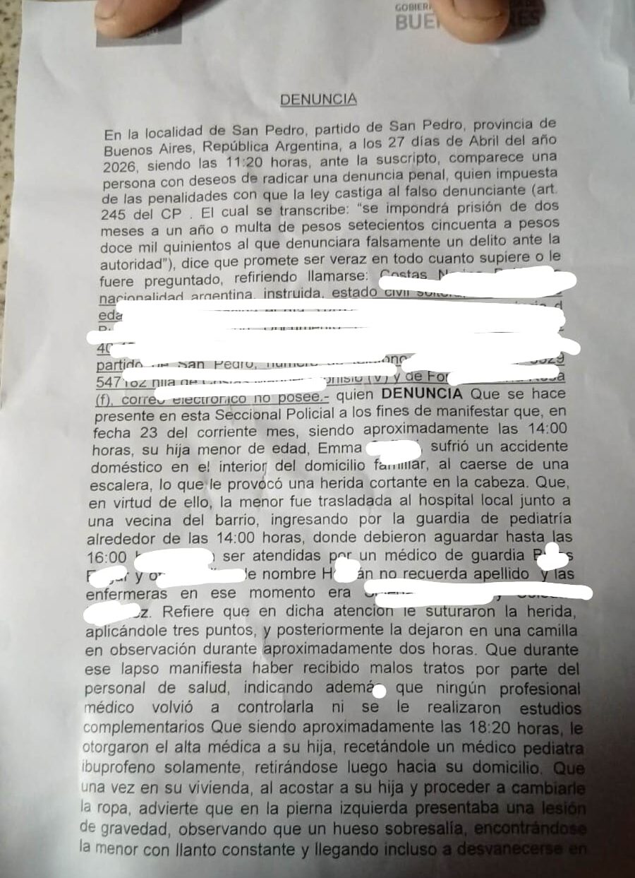 Según consta en la denuncia radicada el 27 de abril, el hecho se originó días antes cuando la niña sufrió una caída en el interior de su vivienda, tras tropezar en una escalera mientras jugaba. Como consecuencia, presentaba una herida cortante en la cabeza, por lo que fue trasladada de urgencia al hospital.