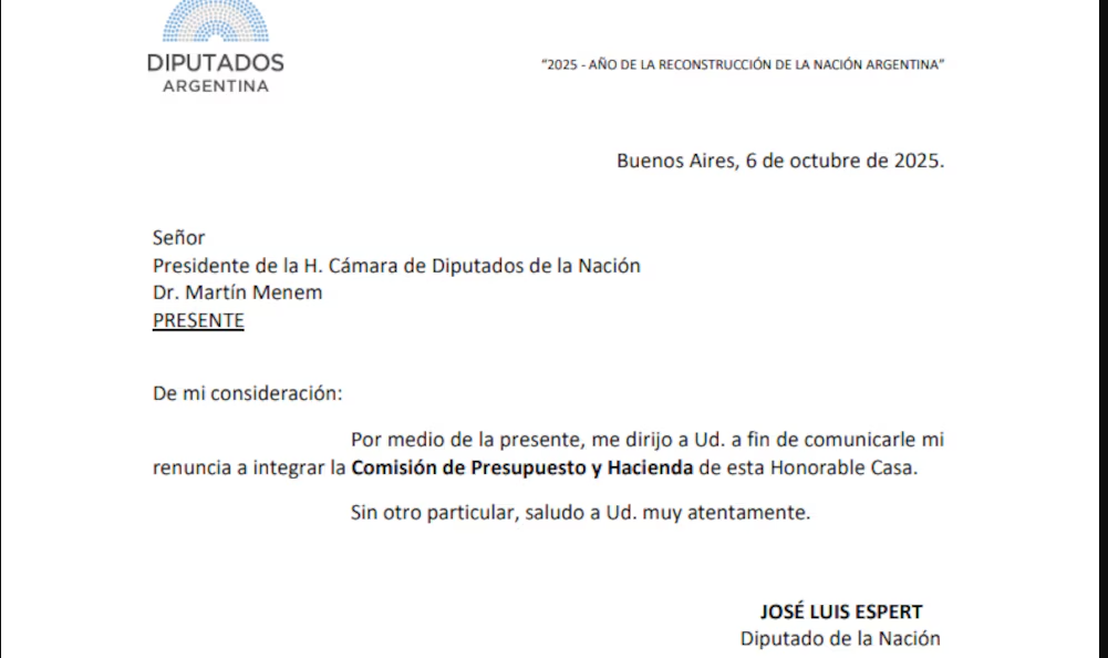 José Luis Espert renunció a la Comisión de Presupuesto y Hacienda de la Cámara de Diputados. La decisión fue oficializada esta mañana, a través de una nota presentada ante el presidente de la Cámara, Martín Menem.