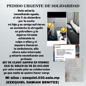 Una joven de 19 años permanece internada luego de haber sufrido un grave accidente el pasado 2 de diciembre por la noche, cuando la motocicleta en la que circulaba junto a una amiga colisionó con un patrullero de la Policía de la Provincia de Buenos Aires. Su familia inició una campaña solidaria para reunir fondos para una prótesis valuada en más de dos millones de pesos.