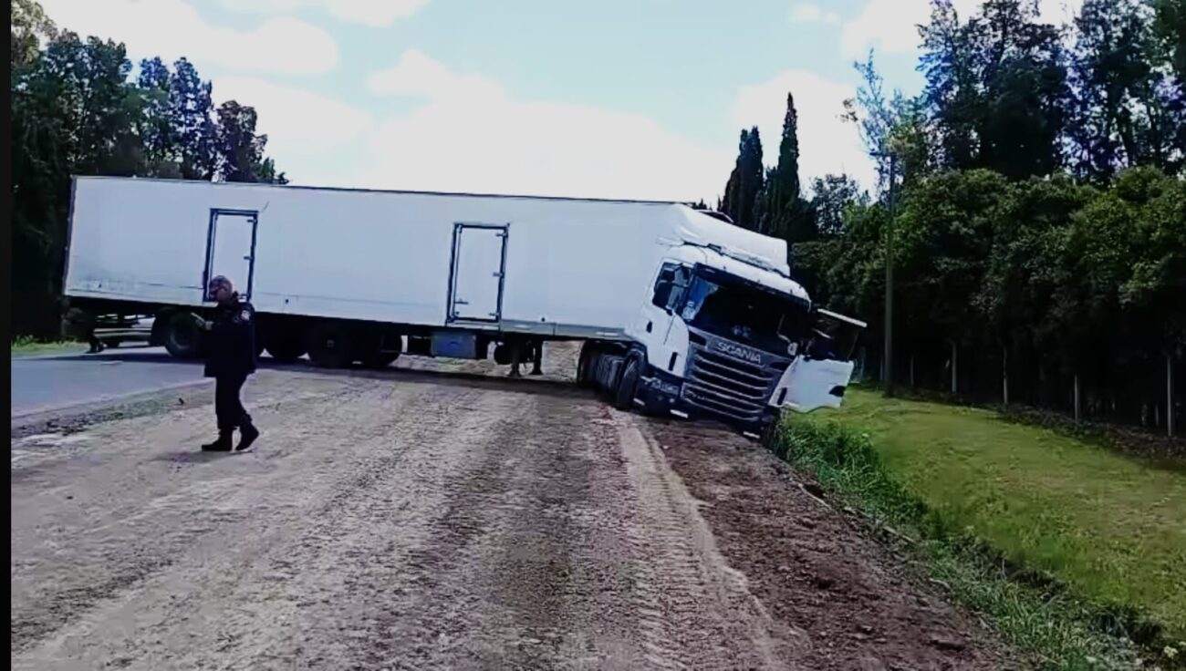 Pasadas las 13 horas, el conductor del semirremolque intentó ejecutar un giro en U, pero una parte del terreno cedió bajo el peso del rodado y el vehículo quedó trabado y en riesgo de desbarrancarse, bloqueando por completo la circulación.