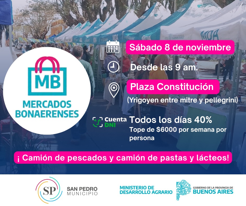 El sábado 8 de noviembre, desde las 9:00 de la mañana, el programa Mercados Bonaerenses se realizará en Plaza Constitución (Yrigoyen entre Mitre y Pellegrini), ofreciendo una nueva jornada con productos frescos, locales y a precios accesibles.