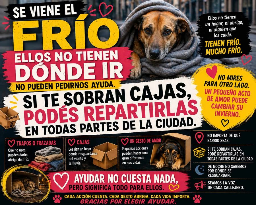 A través de una campaña que se viraliza en redes sociales, se convoca a la comunidad a realizar un gesto simple pero significativo: colocar cajas con trapos o frazadas en distintos puntos de San Pedro para que los perros callejeros puedan resguardarse del frío.