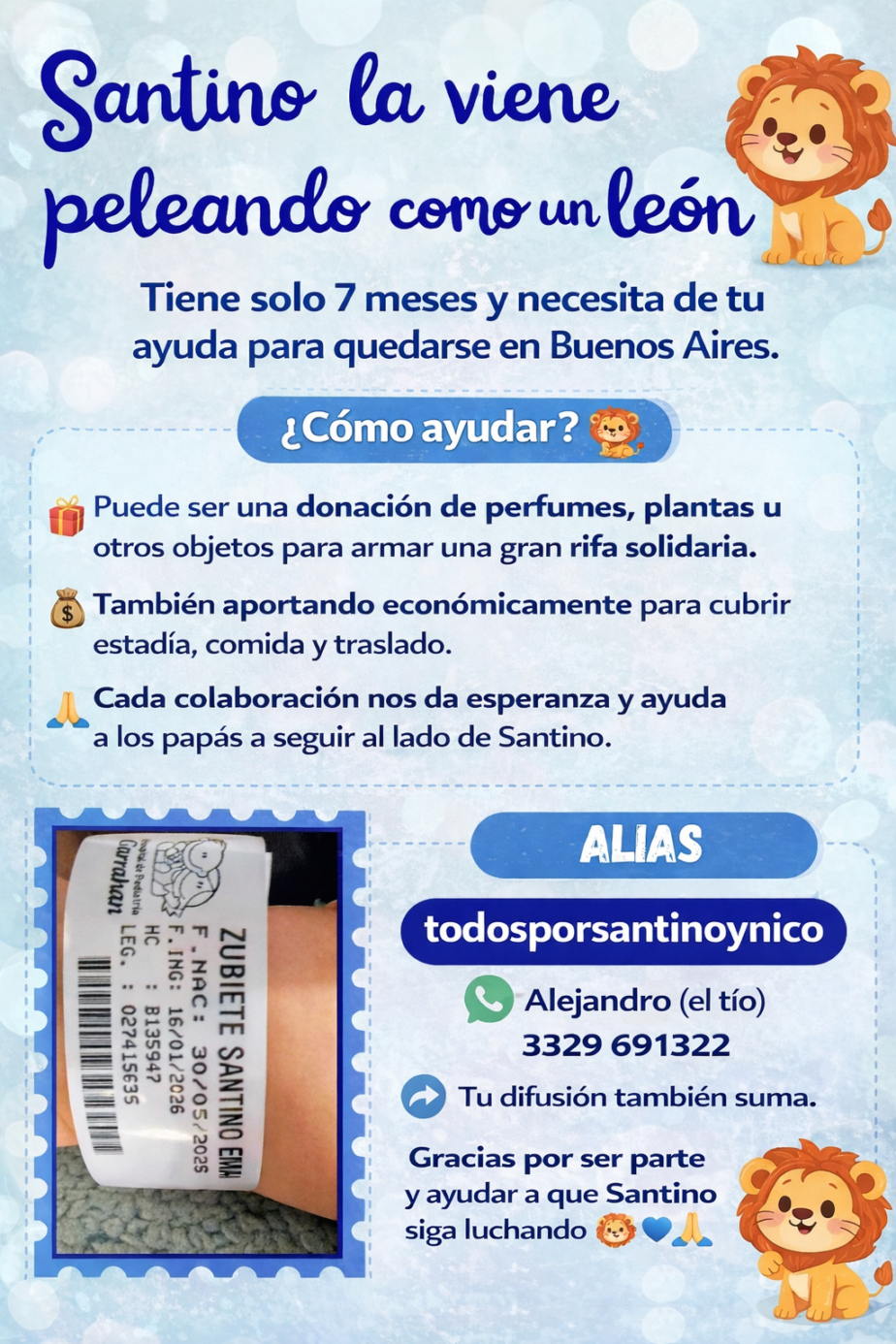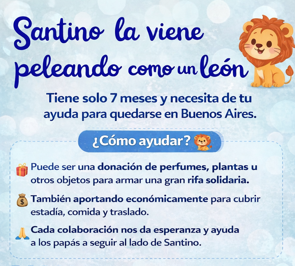 Por este motivo, la familia solicita difusión del flyer solidario y la colaboración de la comunidad. Quienes puedan ayudar pueden hacerlo mediante donaciones de objetos para armar una rifa solidaria (perfumes, plantas u otros productos), con el objetivo de solventar los gastos de estadía, alimentación y traslado durante este tiempo.