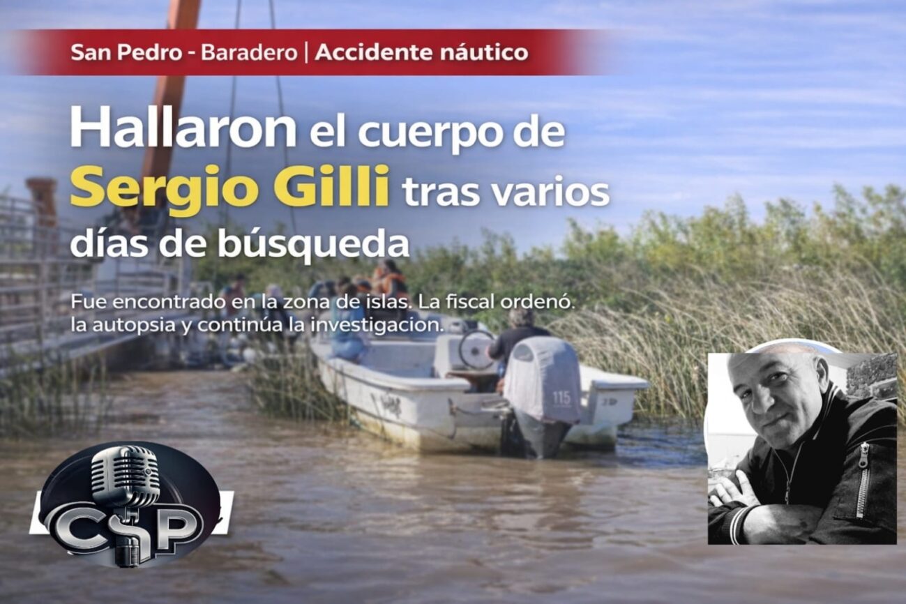 Este viernes fue hallado el cuerpo de Sergio Gilli, el hombre que permanecía desaparecido luego del accidente náutico ocurrido en la zona de islas entre San Pedro y Baradero. El hallazgo se produjo en cercanías del lugar donde se había producido el hundimiento de la embarcación, en el marco del operativo de búsqueda que se extendió durante varios días.