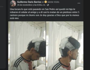 Este 26 de noviembre por la mañana, un joven de 22 años fue víctima de un violento robo en la zona de barrancas de San Pedro, en la intersección de las calles Mitre y Boulevard Paraná. Según se informó, un grupo de cinco sujetos lo atacó y le sustrajo su teléfono celular. Durante el hecho, la víctima sufrió golpes en la cabeza que requirieron asistencia médica en el Hospital local.